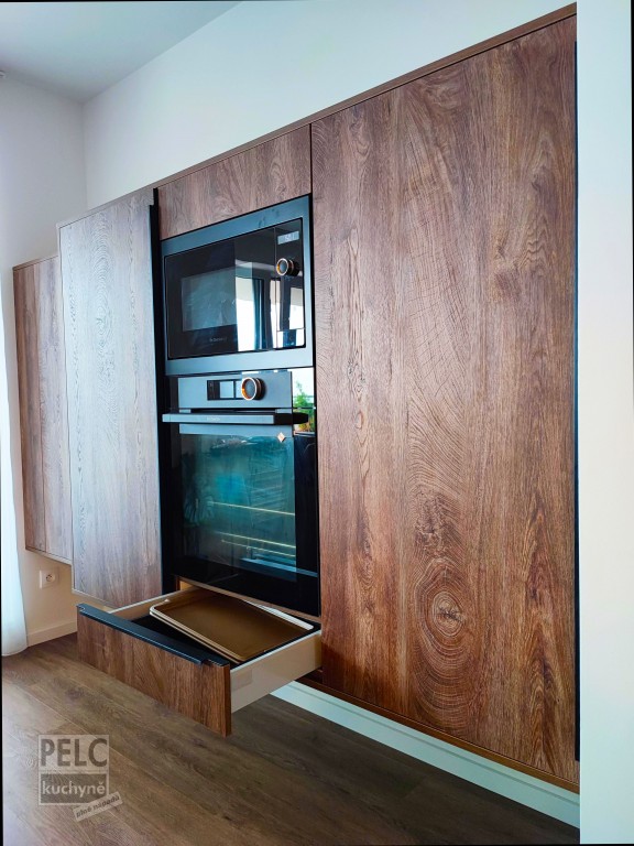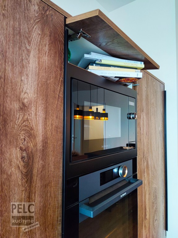 Kuchyně patří mladému páru z Prahy 3. Pán mi dal volnou ruku při komponování ergonomie a designu. Určili jsme si společně finanční limit, vybrali jsme dekory a pohledové materiály. Ve výběru barevných variant se vkusně přičinila mladá dáma. Společně se čtyřnohým mazlíčkem sdílejí prostory svého domova. Právě kvůli návyku pejska, ležet u nohou během stolování vznikla myšlenka nadesignovat stolování tak, aby zbytečně nepřekážely nohy stolu při pohodlném odpočinku pejska. Samozřejmě tento nápad nese i výhody údržby a v neposlední řadě efekt a design levitujícího stolu, který si zamiloval mladý pár na první pohled. Netradičním řešením je také nízká sestava chladničky, trouby, mikrovlnky a potravinové skříně. Segmenty jsou zavěšeny na stěně a vytvářejí tak odlehčený objem nábytku, který ladí s „levitujícím“ stolem v ostrůvku. Jako další velmi vkusný prvek je světelná police s oboustranným osvětlením. Aby vynikl světelný efekt z police, rozhodli jsme se na zástěnu aplikovat reliéfní materiál s dekorem golfového míčku. Pracovní deska je z ušlechtilého masivního přírodního kamene s povrchovou úpravou ANTIK. Naopak na dvířkách je moderní protiotiskový vodotěsný materiál AKRYL HARD MAT s hlubokým sametovým povrchem. Spolehlivé a výkonné spotřebiče značky DeDietrich dokonale ladí s kuchyní a dodávají jí technickou zdatnost na profesionální úrovni. Zátěžový test levitujícího stolu si mladý pár otestoval společným tancem na stolové desce.